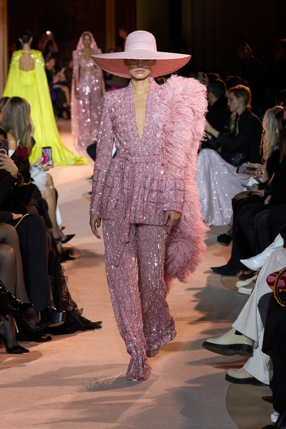 The entire collection oozes effortless, ethereal romance. The embellished cut out blazer and the hat & scarf combo (Look1) is telling me to run off to the South of France and delve into a whirlwind romance with a Parisian beau. Let’s also pay attention to the use of colours like lime green, orange and pink to bring life to the collection alongside the plumes of feathers and crystals wrapped around the bodies of the models.